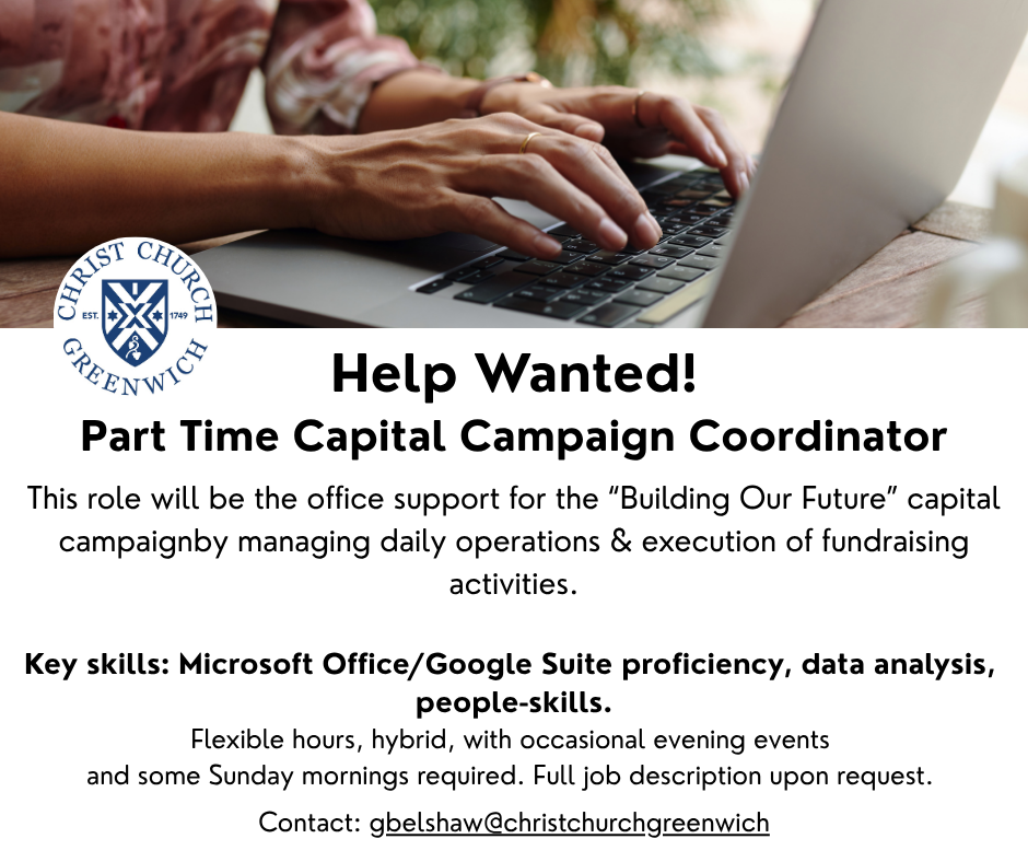Christ Church Greenwich is looking to hire a part-time facilities associate to perform general maintenance and cleaning in and around the buildings, adjacent grounds, and maintain equipment in orderly and functional condition. Provides assistance to staff, visitors and other employees as necessary. More details provided during the interview.